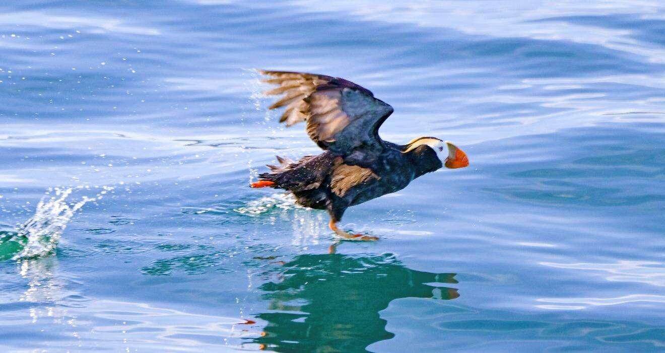 堪察加,海鹦喙部短而厚,繁殖期呈现鲜艳的红、黄、蓝三色(非繁殖期颜色变暗淡),是其标志性外观。